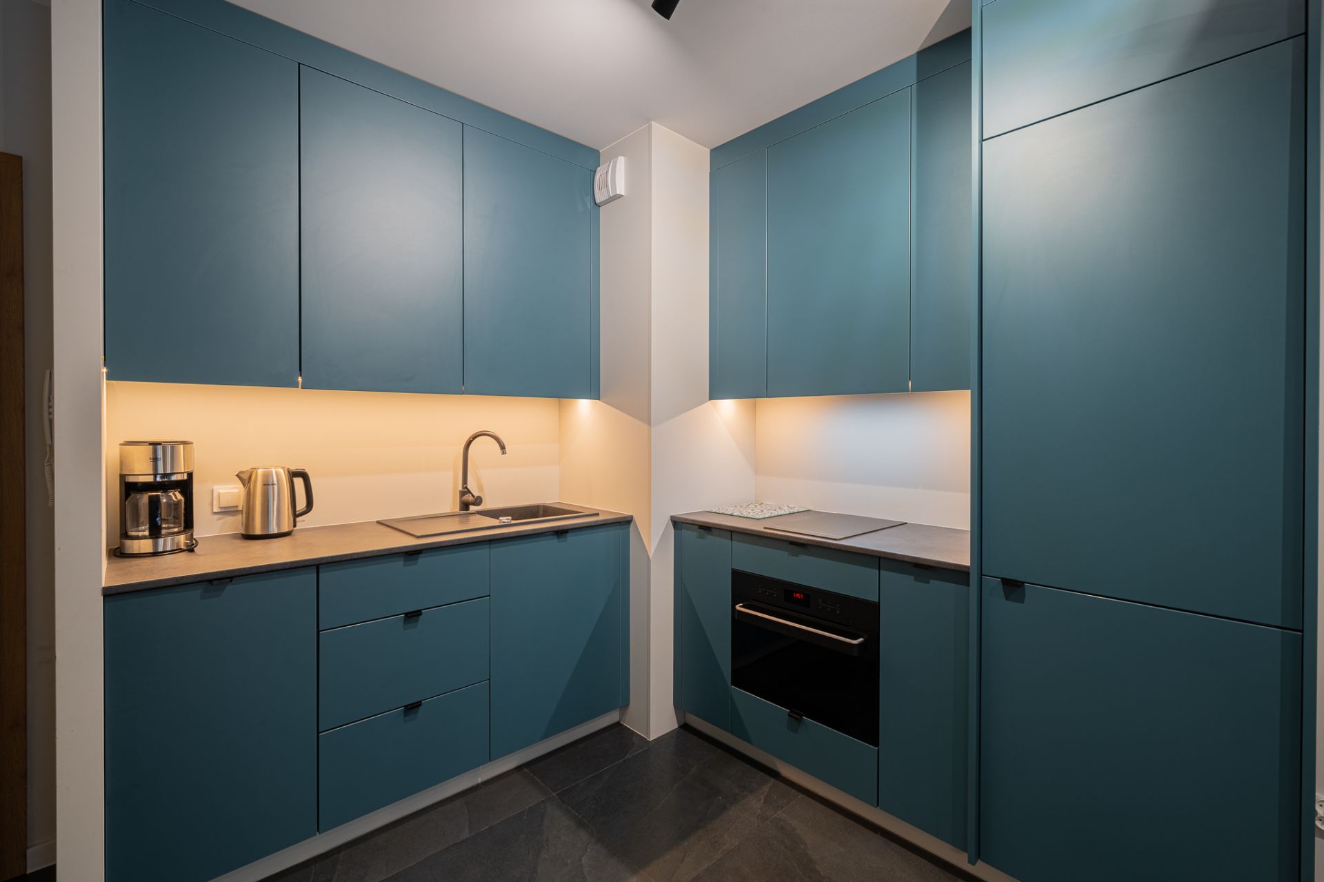 Aneks kuchenny posiada wszystko, co potrzebne na wygodny pobyt: płytę, czajnik, dużą zabudowę kuchenną, lodówkę, ekspres do kawy oraz podstawowe naczynia.