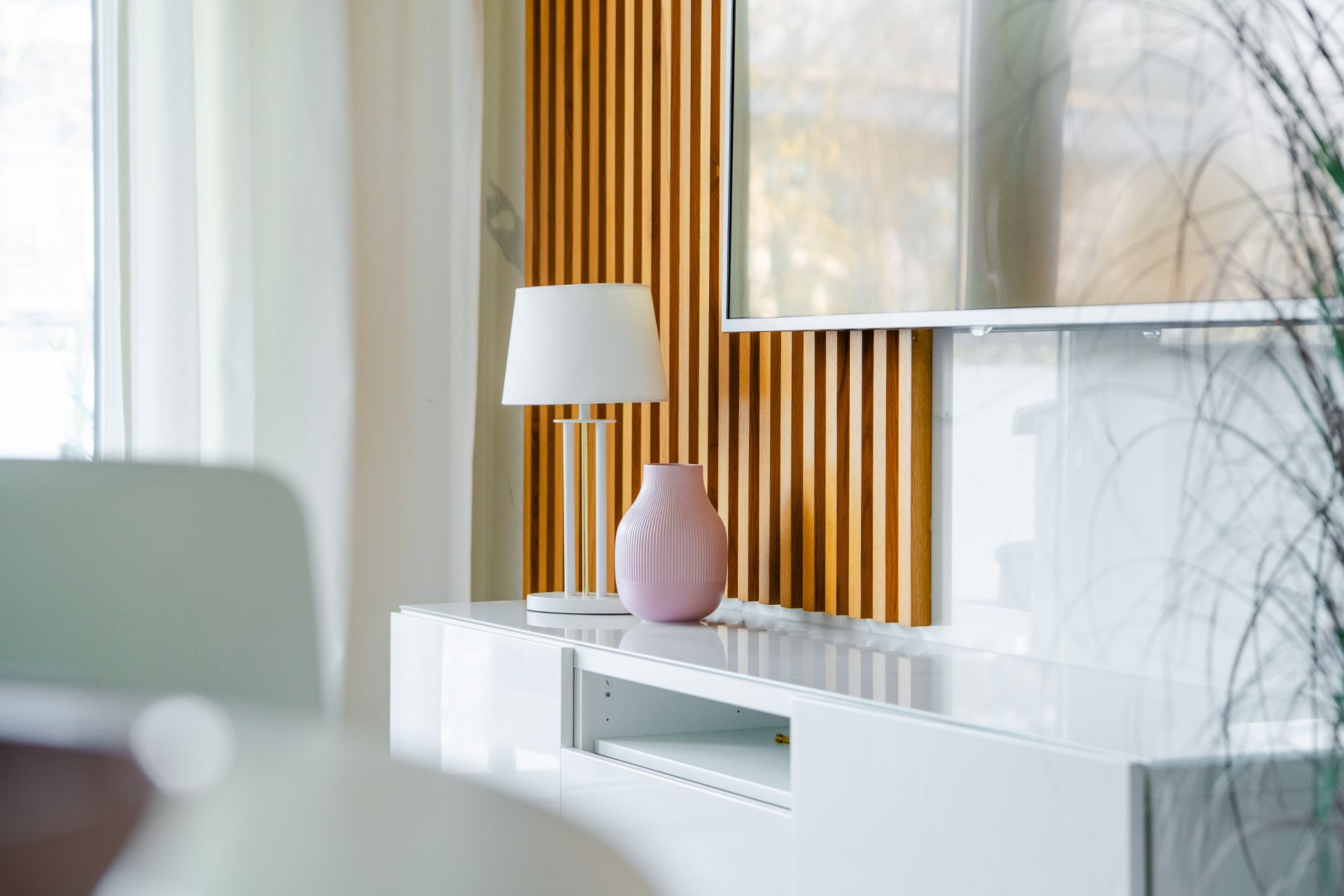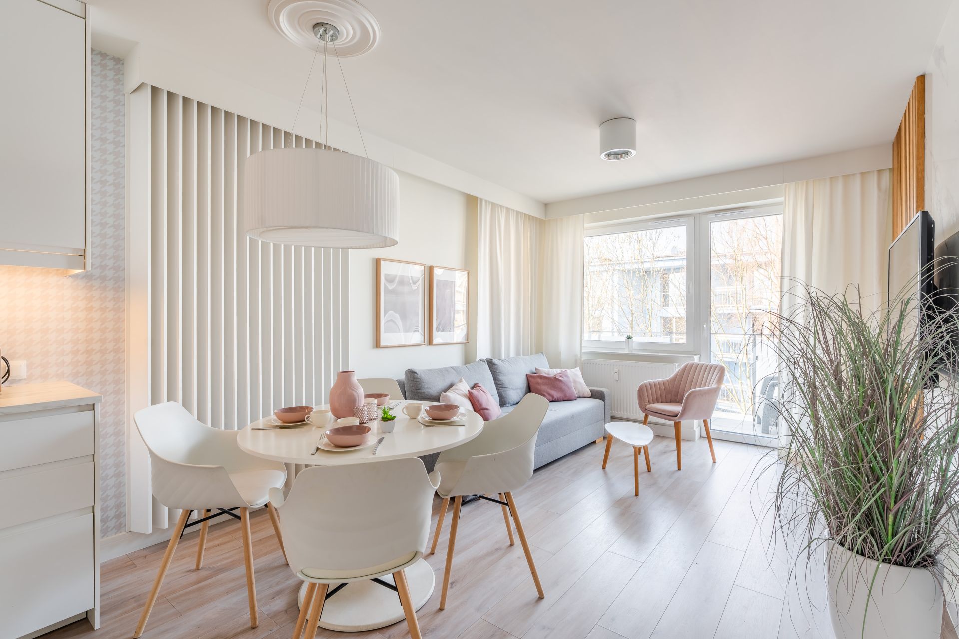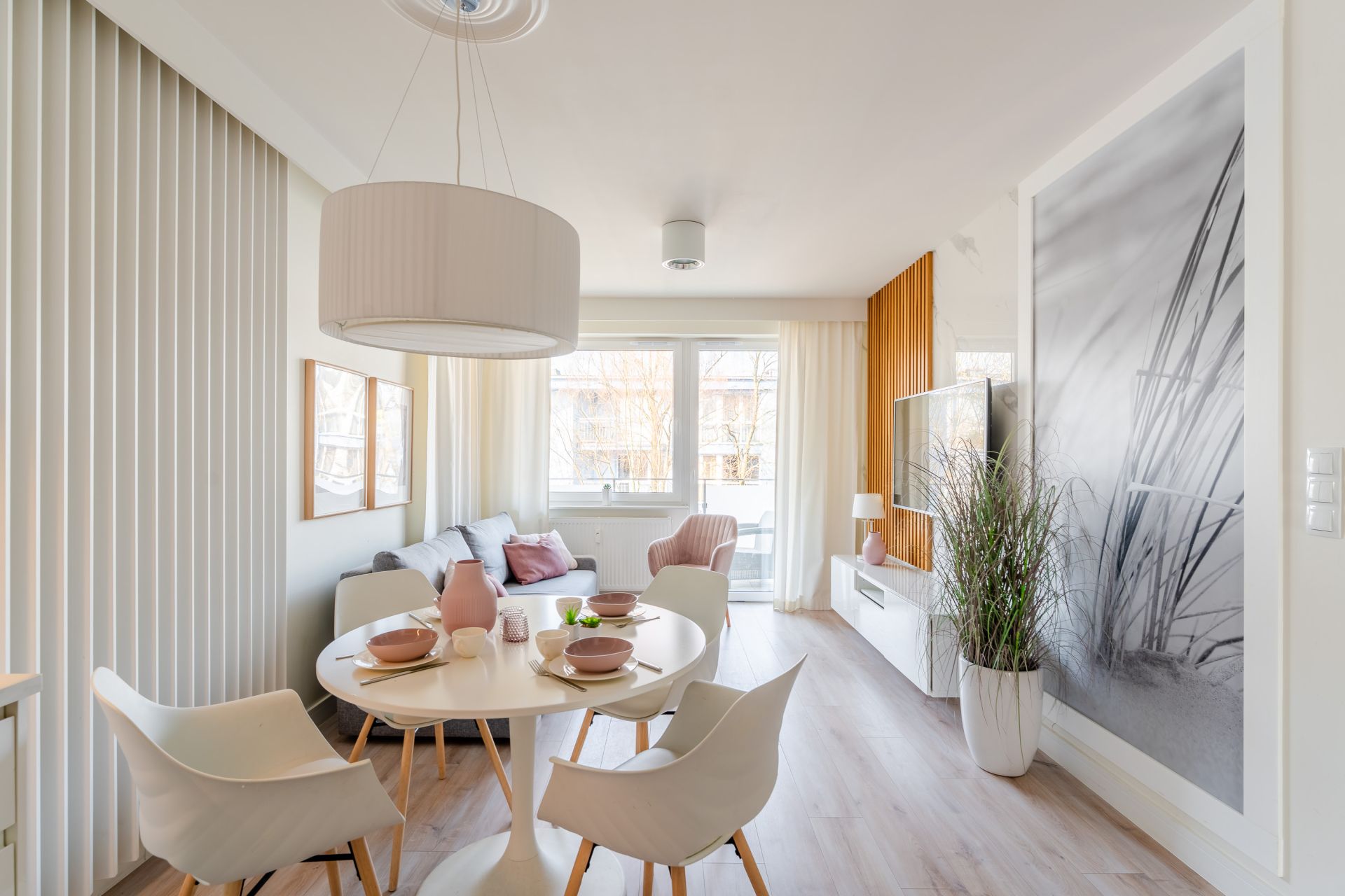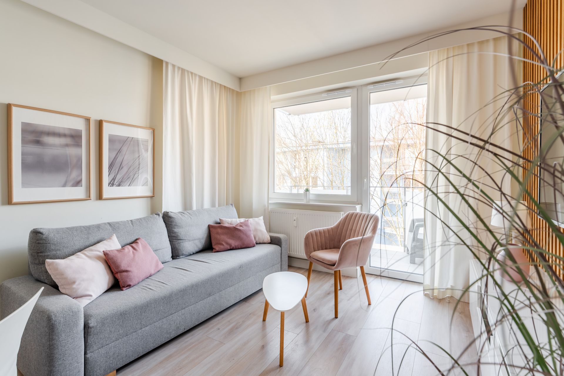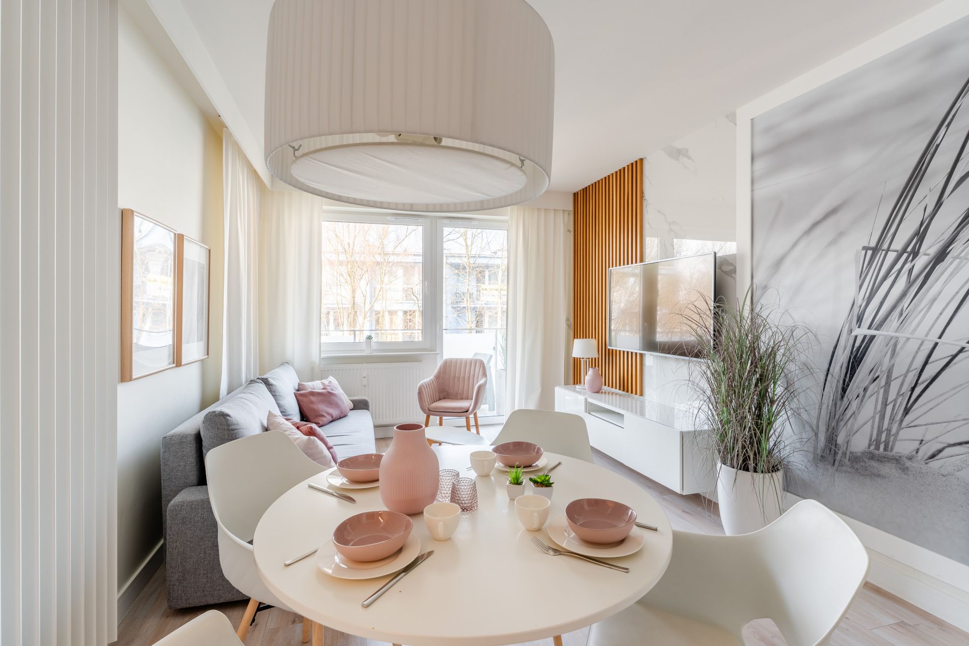 Przestronny salon sprzyja odpoczynkowi – rozkładana sofa, telewizor i wyjście na balkon tworzą idealne miejsce do relaksu po plażowym dniu.