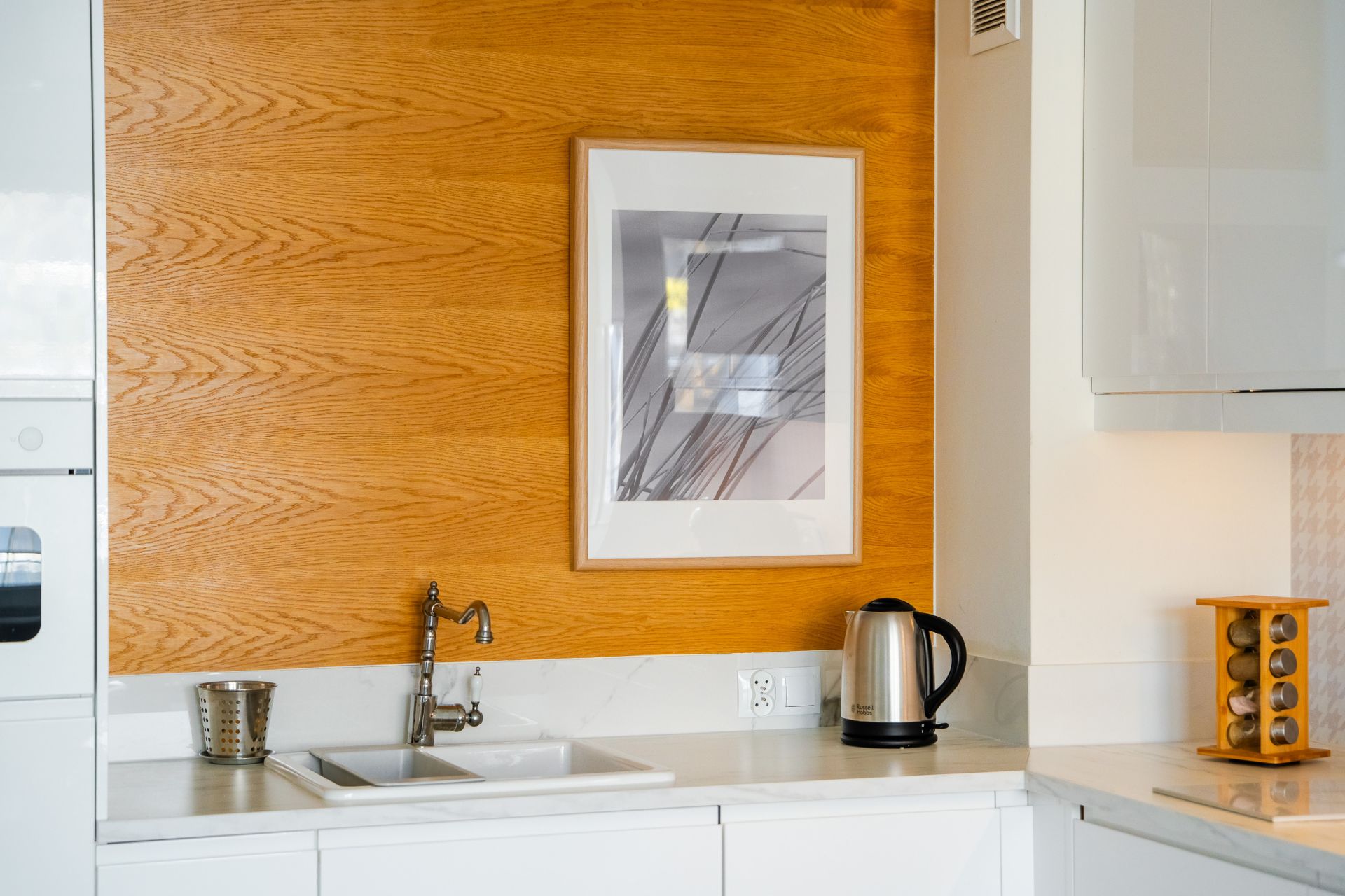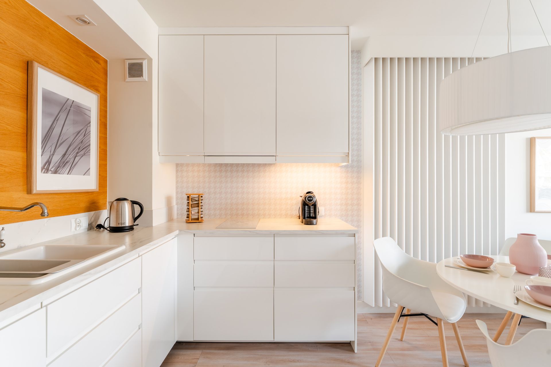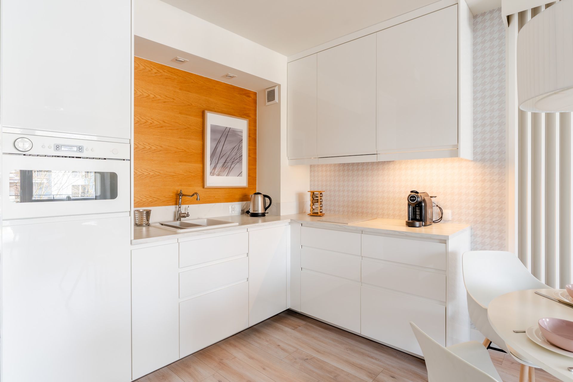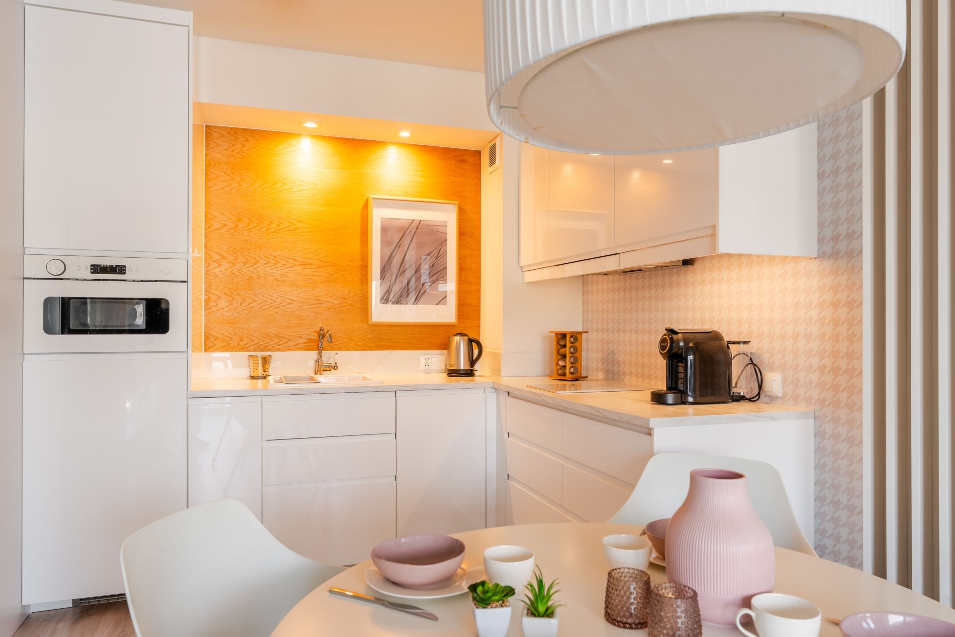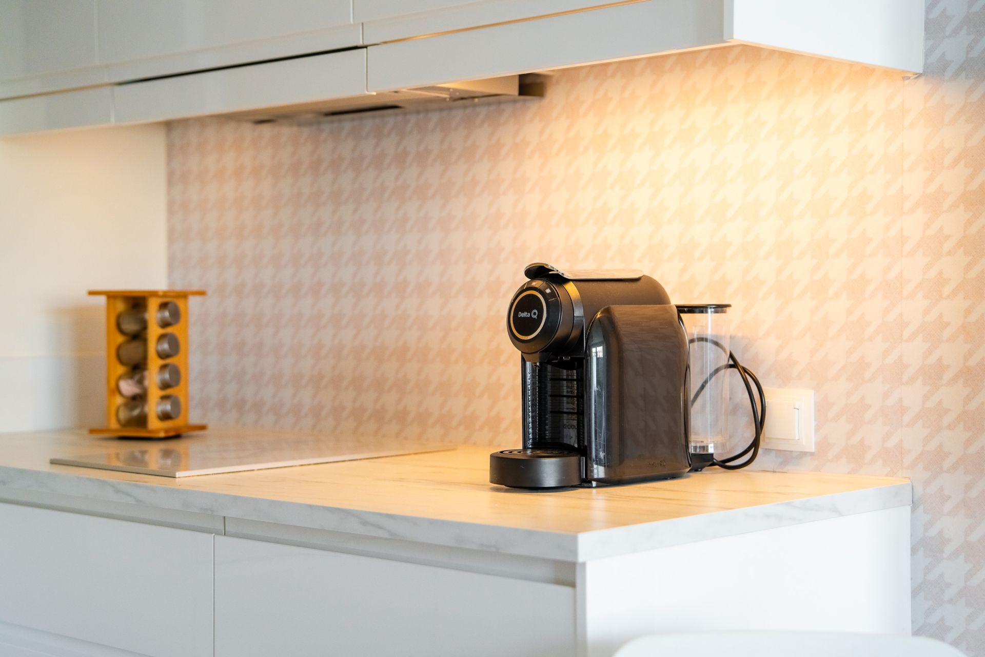 Aneks kuchenny jest wyposażony w płytę kuchenną, mikrofalę, ekspres do kawy, czajnik, lodówkę i zmywarkę.