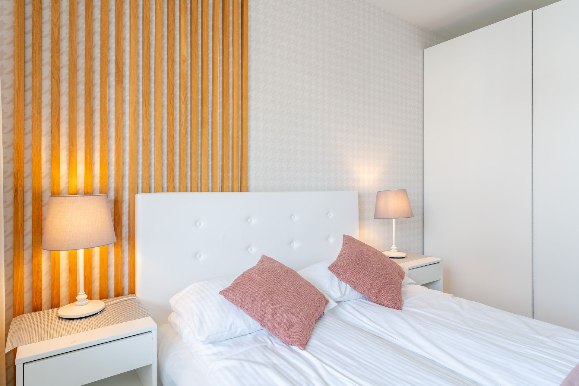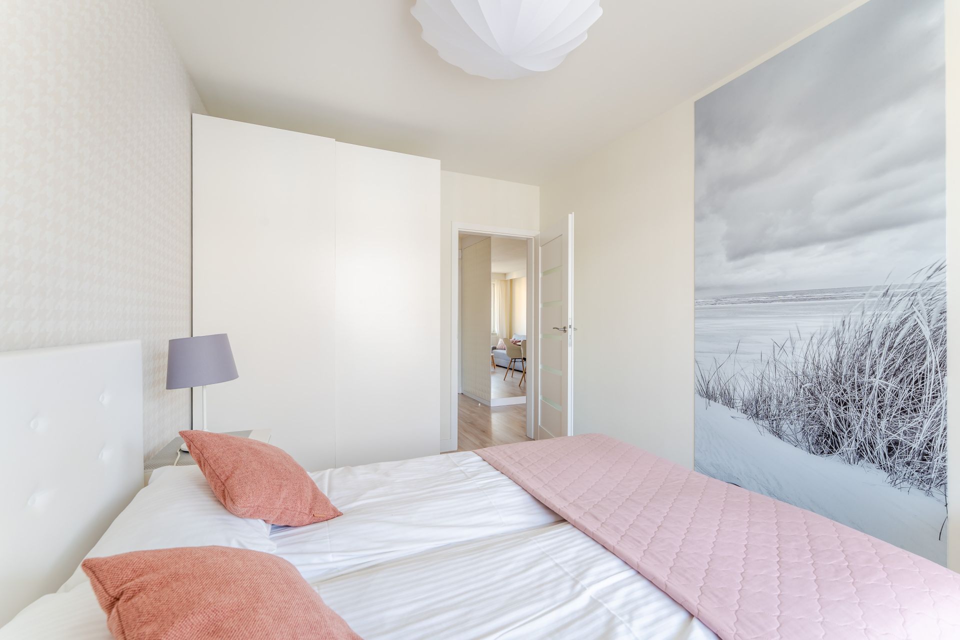 Apartament przeznaczony jest dla maksymalnie 4 osób – w sypialni znajduje się duże łóżko małżeńskie, a w salonie rozkładana sofa.