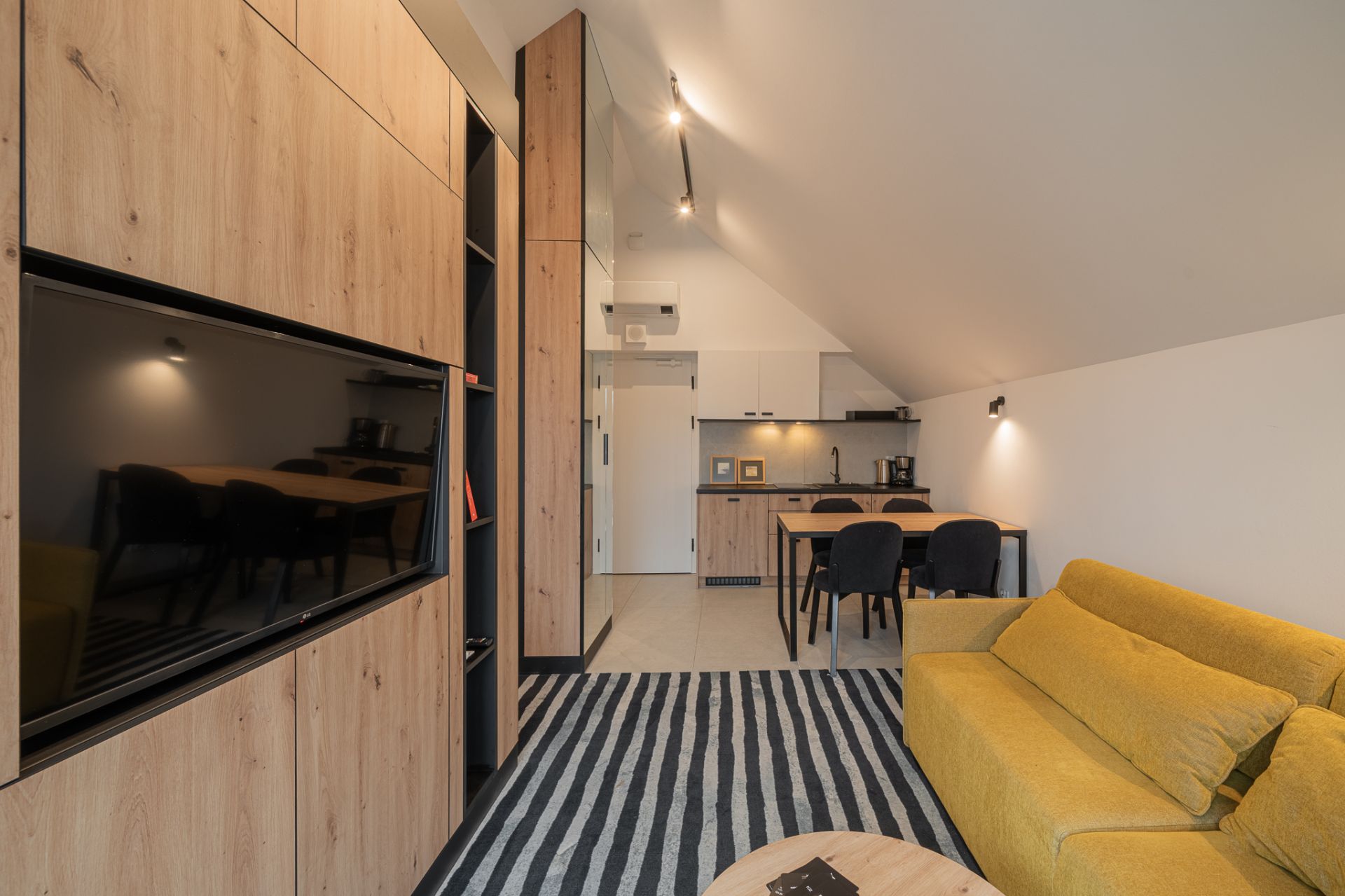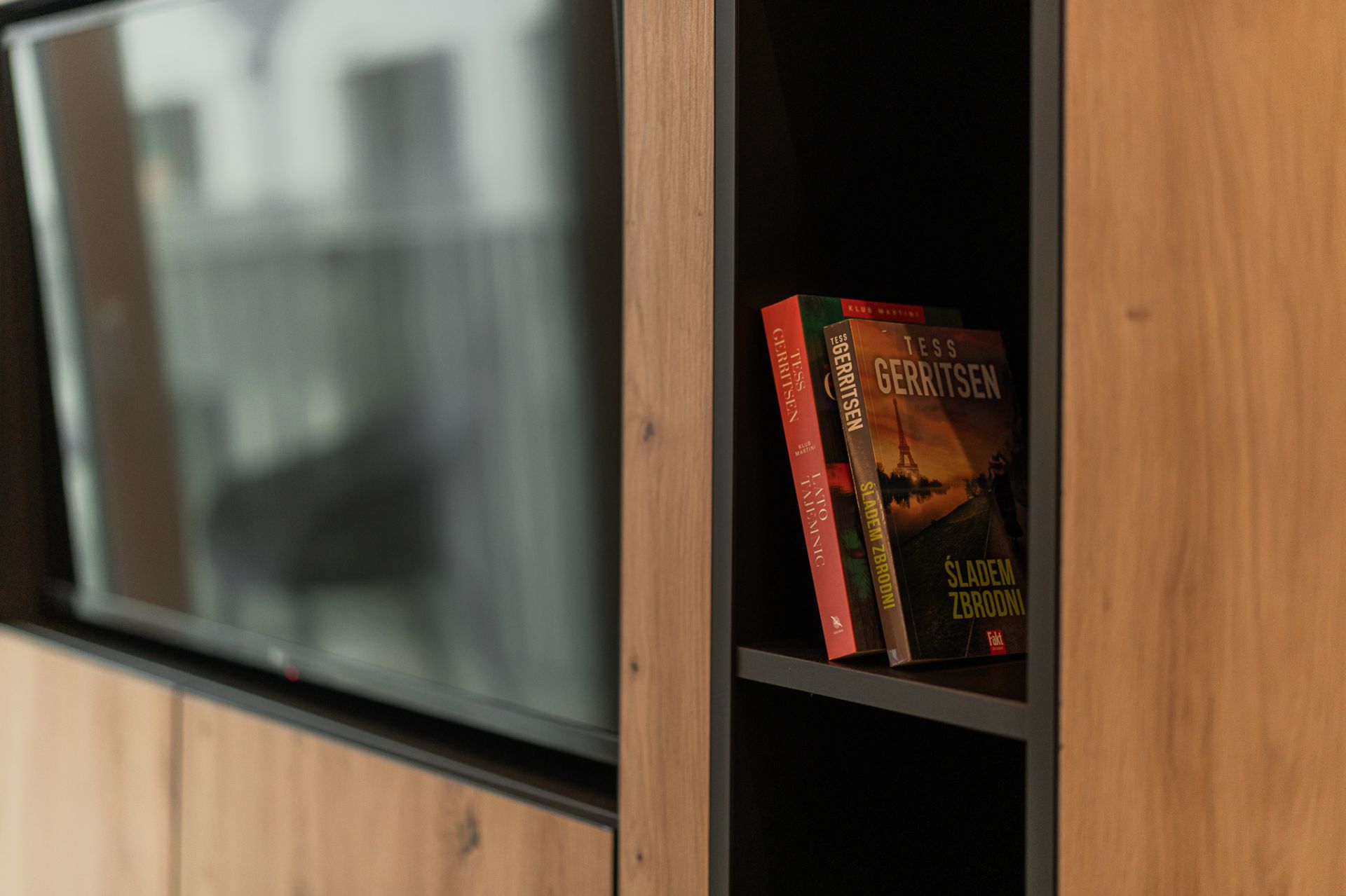 Salon: wygodna rozkładana sofa, telewizor w eleganckiej zabudowie, stół jadalniany, internet