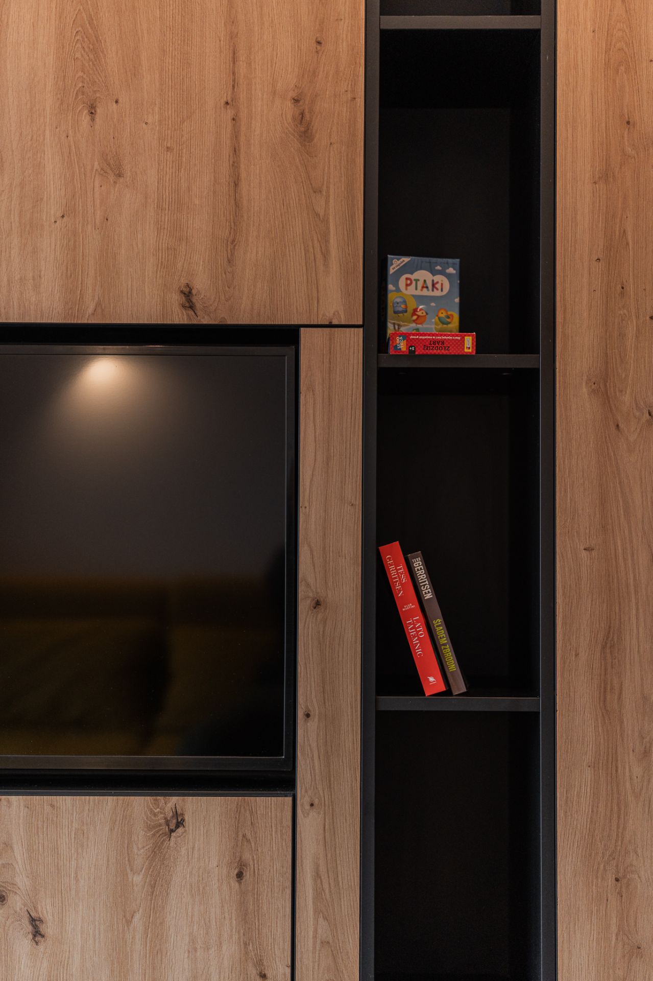 Salon: wygodna rozkładana sofa, telewizor w eleganckiej zabudowie, stół jadalniany, internet
