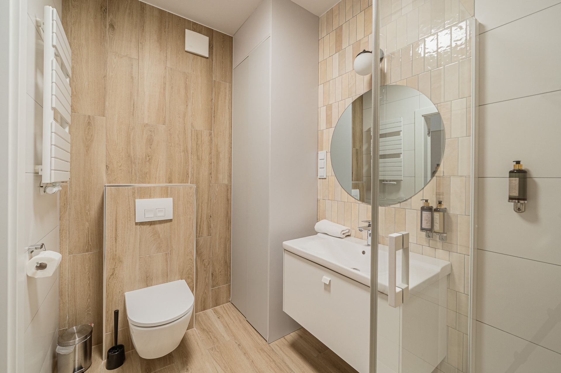 Do apartamentu przynależy indywidualny garaż – dodatkowo płatny, ale bezcenny, gdy przyjeżdżasz autem i nie chcesz martwić się o parking.
