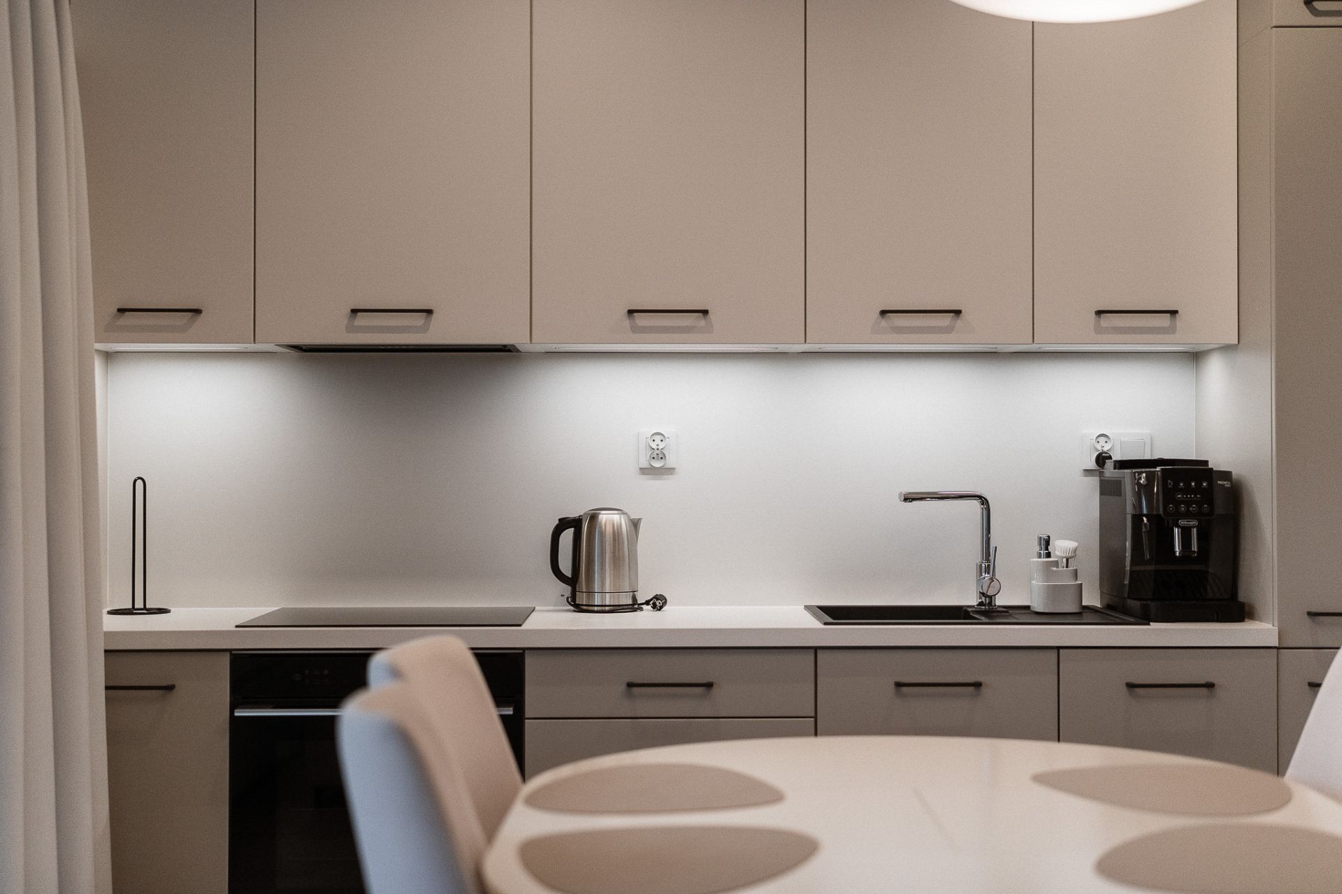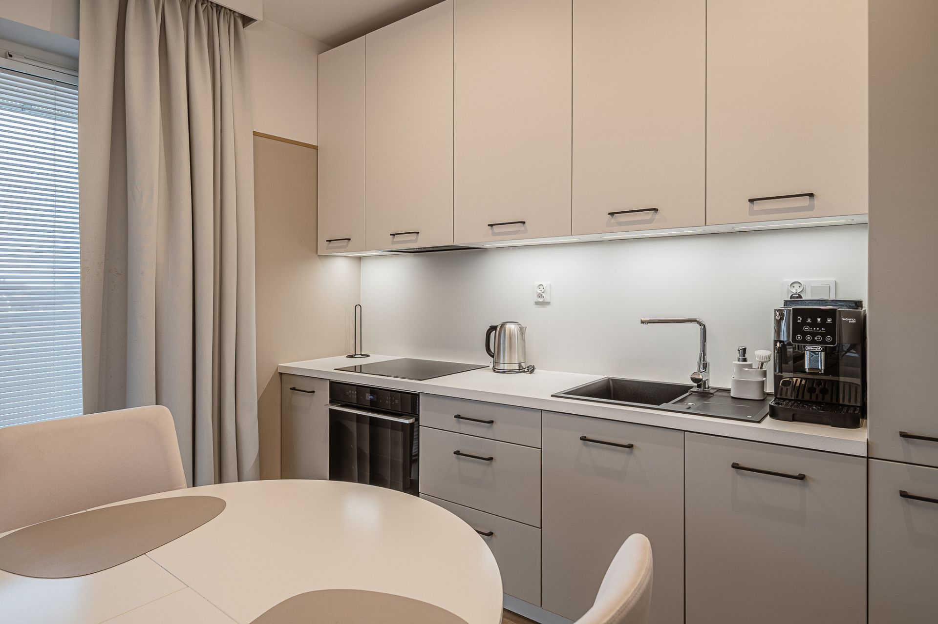płytę kuchenną, piekarnik, ekspres do kawy, czajnik, lodówkę oraz zmywarkę, dzięki której nikt nie musi dyżurować przy zlewie.