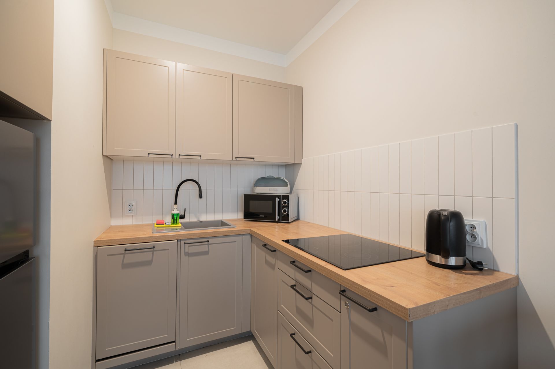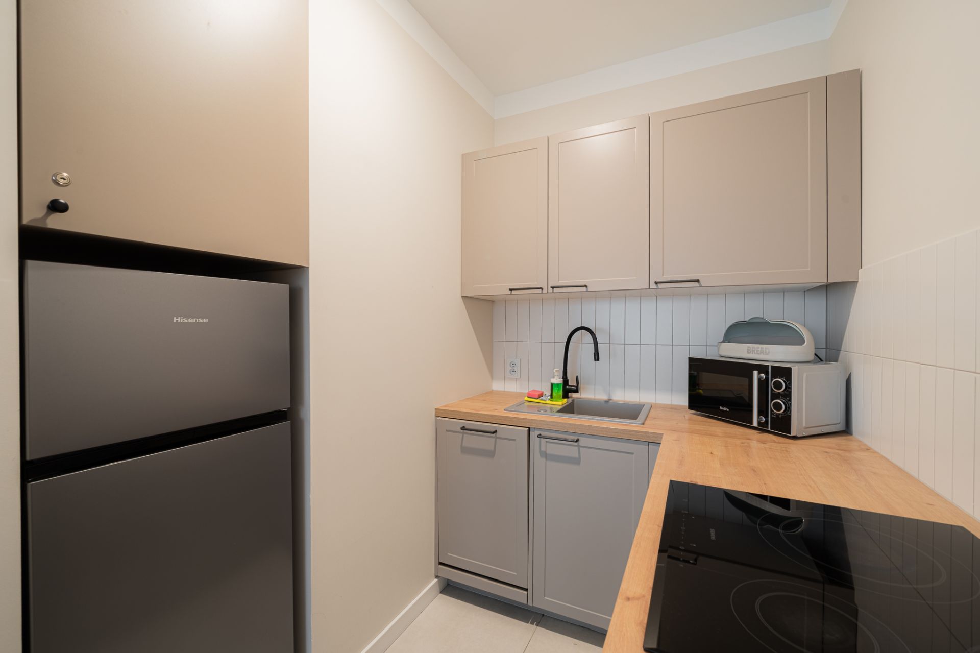 aneks kuchenny z podstawowym wyposażeniem (lodówka, płyta, czajnik, mikrofalówka),
