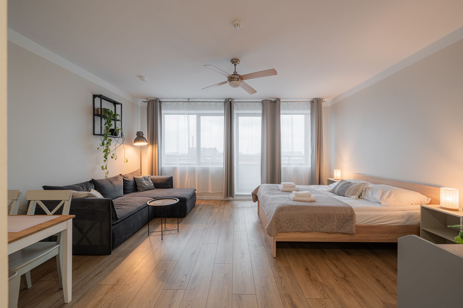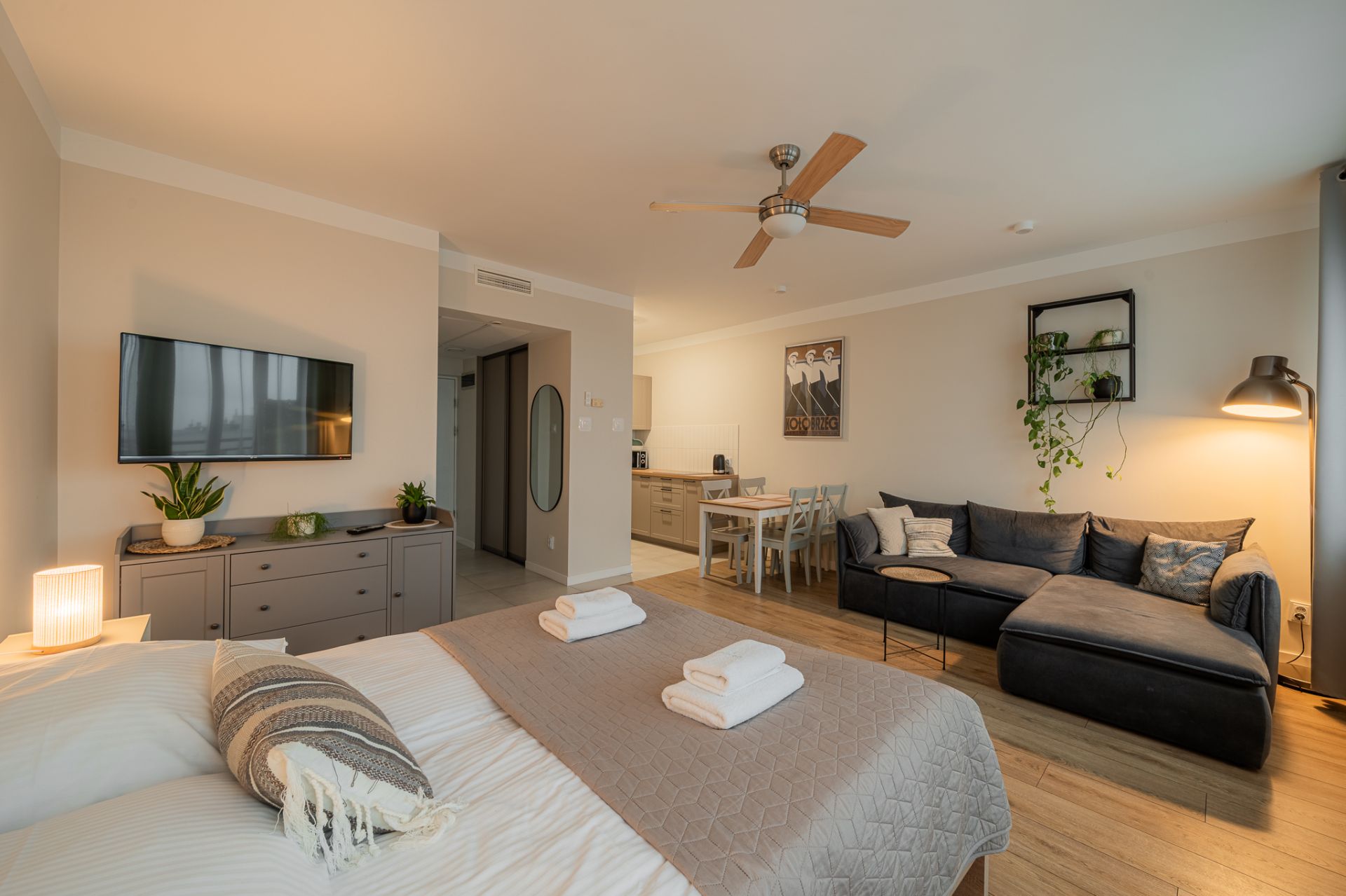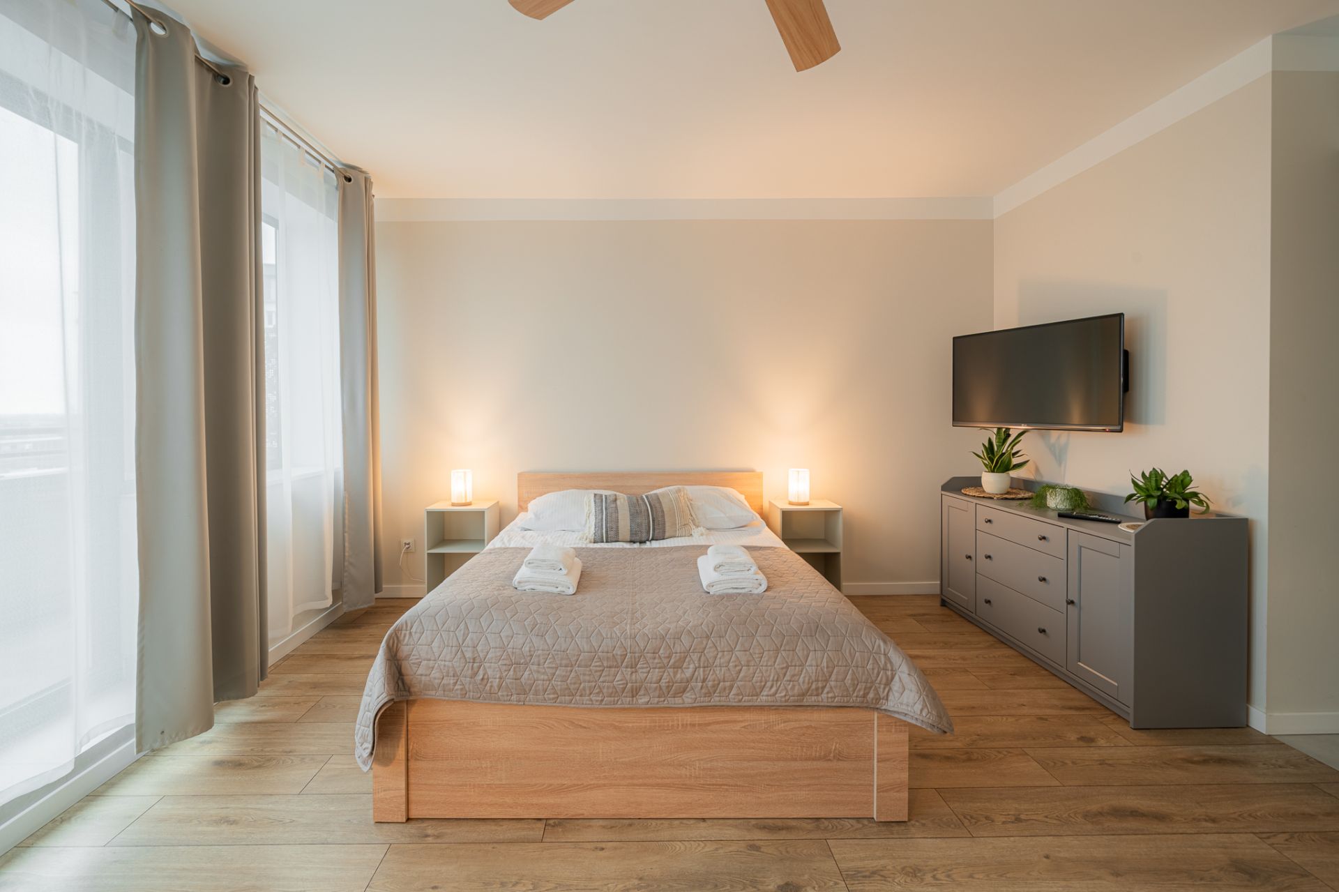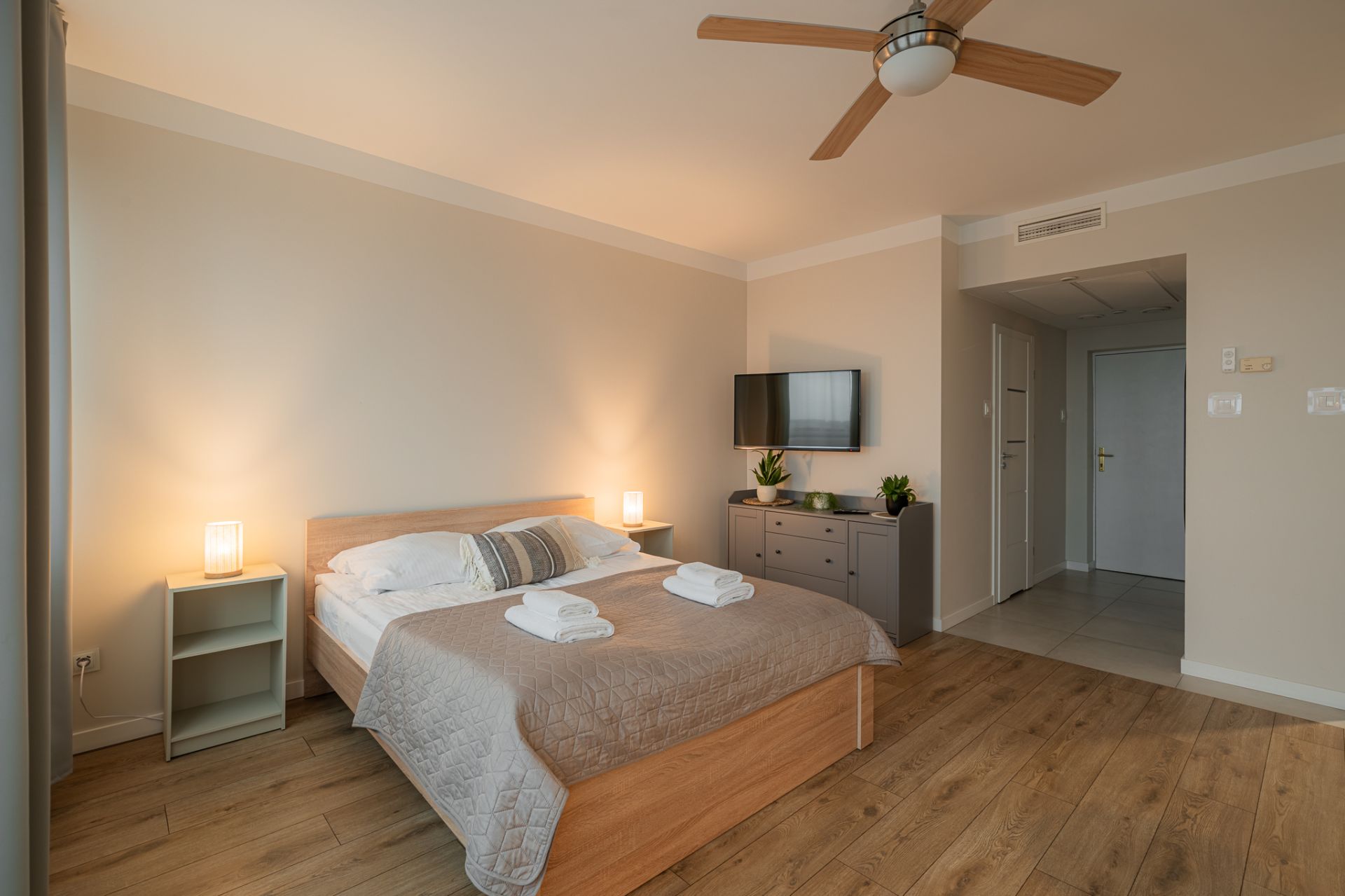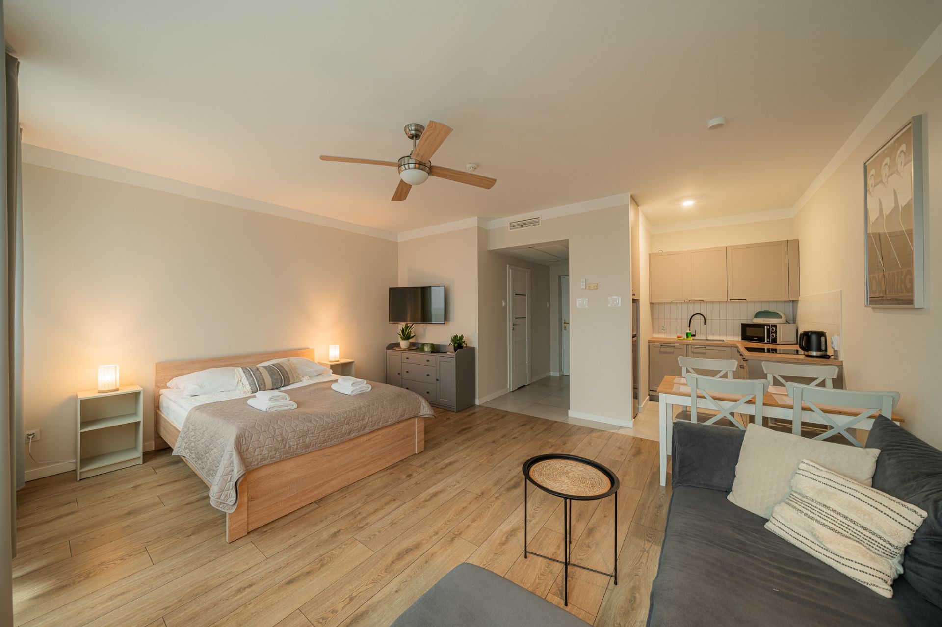 Idealne studio dla osób, które szukają wygodnego, ekonomicznego noclegu w świetnej lokalizacji – tuż przy porcie, w budynku z windą, na 9. piętrze z pięknym widokiem na okolicę.