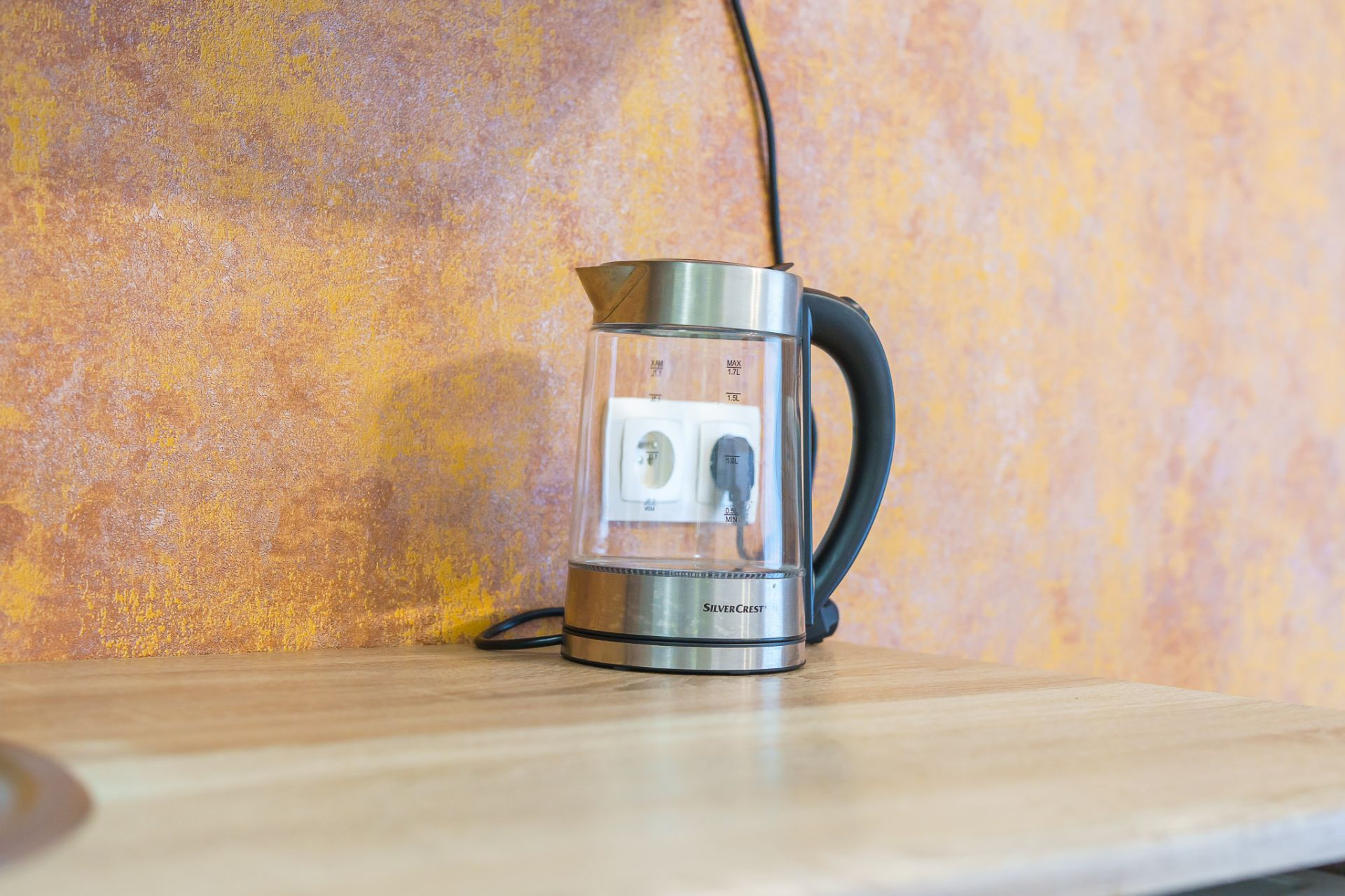 aneks kuchenny z lodówką, kuchenką mikrofalową, czajnikiem i kompletem naczyń.