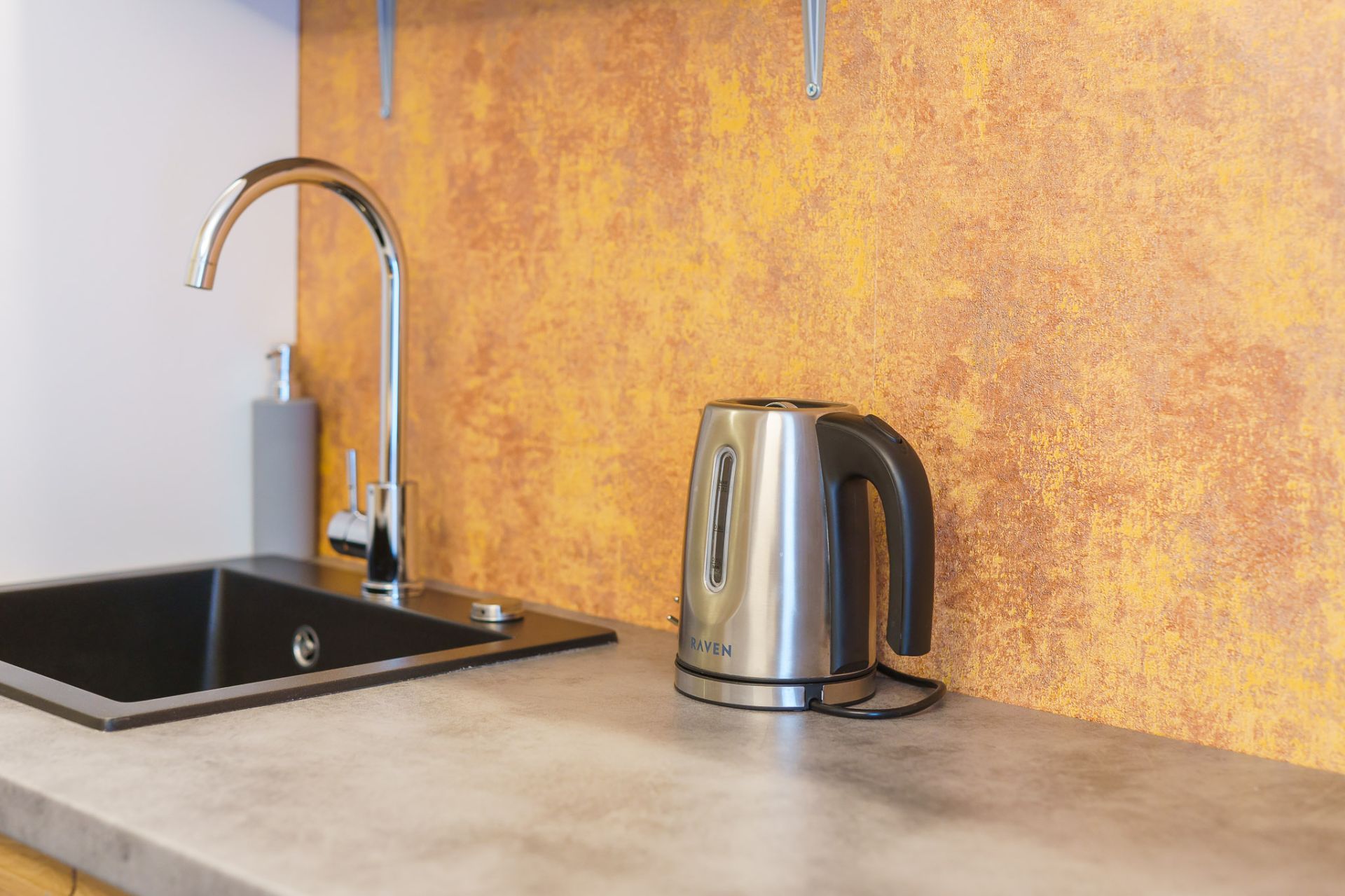 aneks kuchenny z mikrofalą, czajnikiem, lodówką i niezbędnym wyposażeniem.